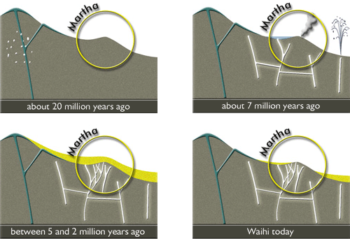 Following the period of geothermal activity, weathering continued to wear down the mountains and hills. The quartz veins running up through the Waihi area were hard to erode and gradually Martha Hill began to protrude above the surrounding land. What was once deep inside the earth was now close to the surface as a result of the forces of heat, cold, wind and rain. However Martha Hill did lose some of its original height, estimated to be about 400 metres.