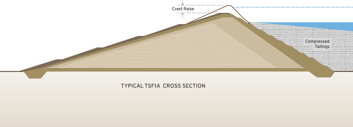 Tailings are pumped to the top of the waste rock embankment and placed into a pond. Here, the fine solids settle and compact. The water in the tailings is decanted from the surface of the pond and sent back to the processing plant to be reused in the grinding circuit.