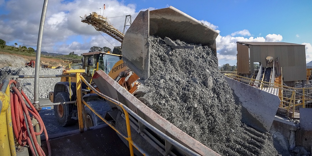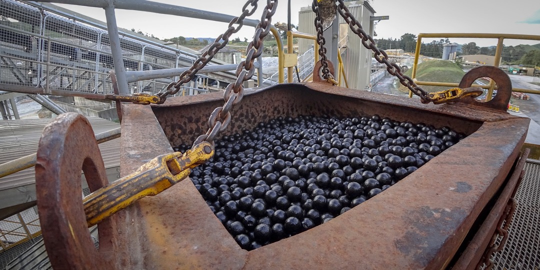 Ore processing is a 24-hour operation. A front-end loader feeds ore from the stockpile near the processing plant into a hopper. The ore falls down onto a conveyor belt and is fed into the SAG mill (semi-autogenous grinding mill) along with water, lime and hardened steel balls.