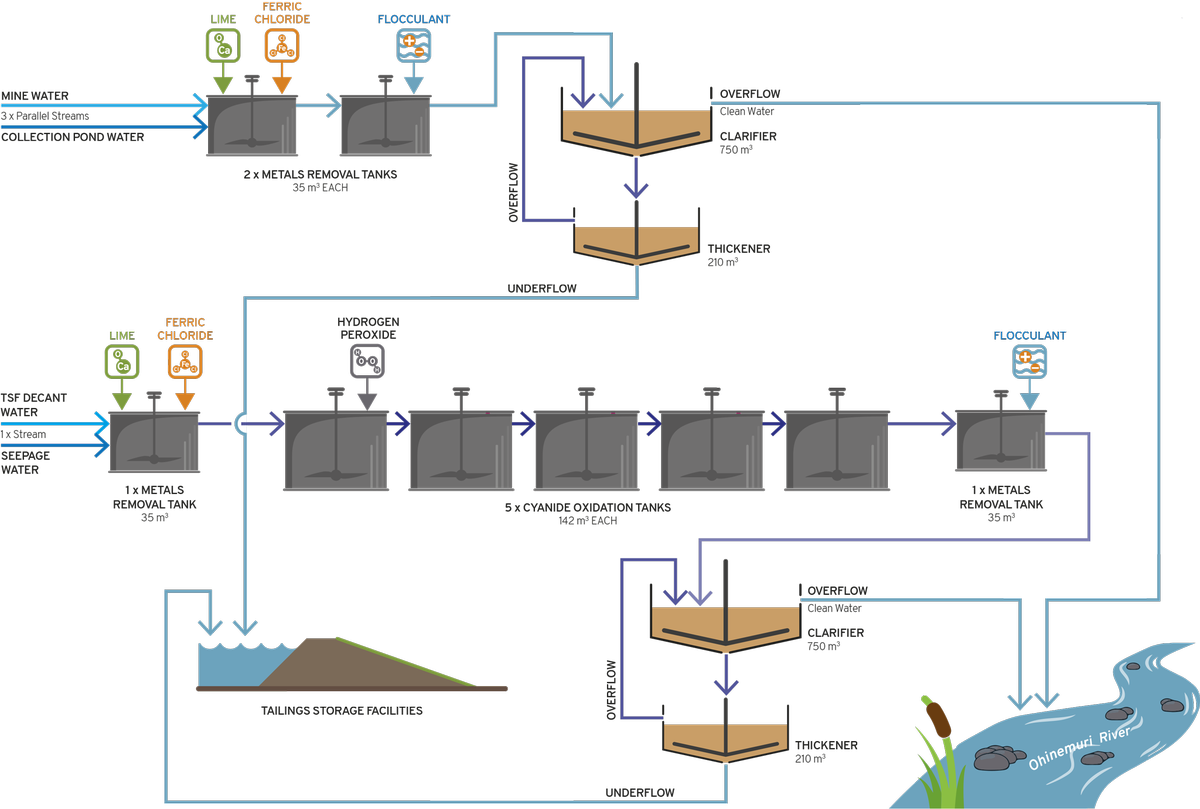 Excess water on site can be derived from a number of sources; some contain cyanide, added during the gold and silver extraction process, some do not. To manage this, the water treatment plant incorporates two distinct treatment stages: